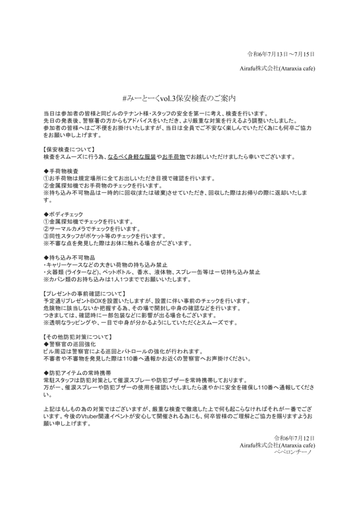 本イベントでは先日の犯行予告を受け、ご入場時に厳重な保安検査を行います。