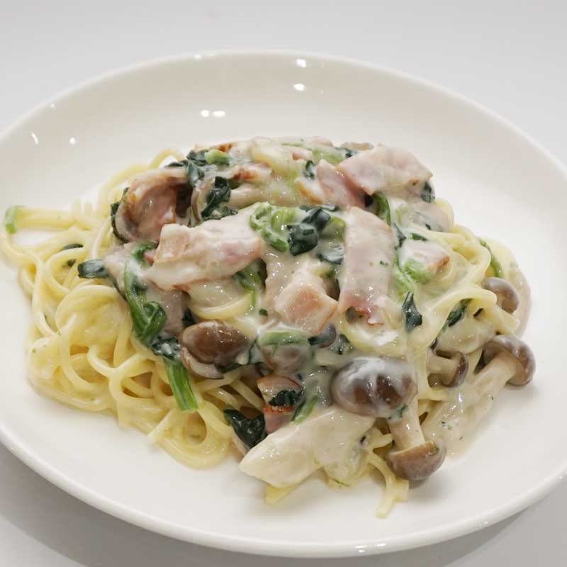 たっぷりベーコンとほうれん草とキノコのクリームパスタ