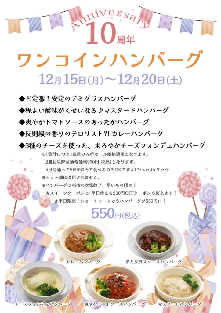 ハンバーグ全種類が【500円(税別)】で食べられます♪