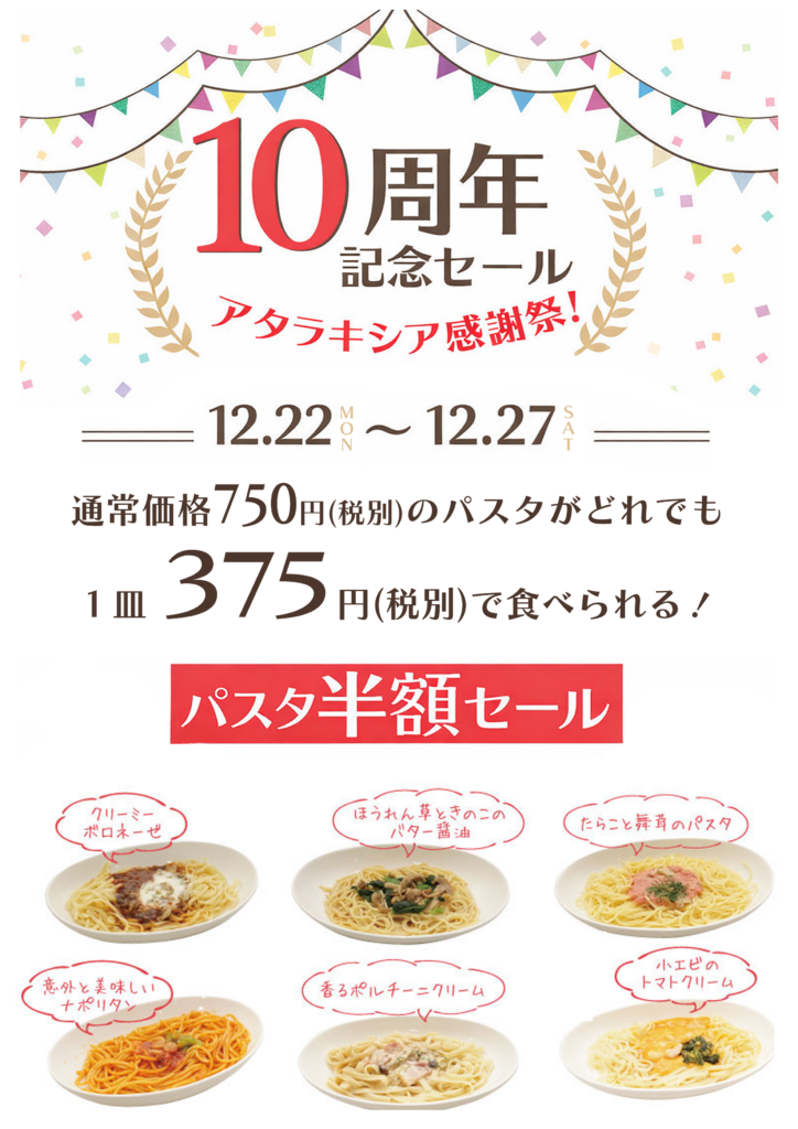祝10周年!パスタ半額感謝祭スタート!